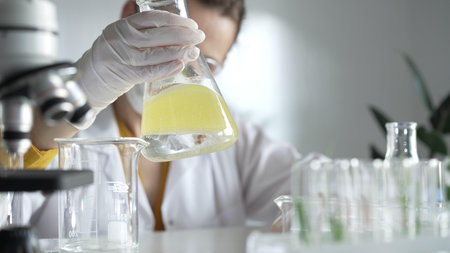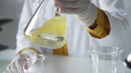 A scientist wearing a lab coat and white gloves is pouring a yellow oily liquid from one beaker to another in a laboratory setting, close up. Science and medicine