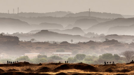 A scenic view of rolling hills layered in morning mist with tiny human figures in the foreground creating a sense of scale and tranquility in the vast wilderness.