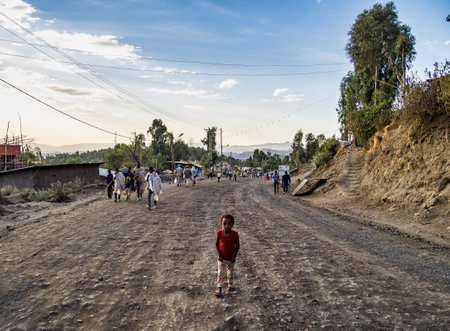 Gondar, Ethiopia - Feb 06, 2020: Ethiopian childs on the roads near Gondar in Ethiopia, Africa