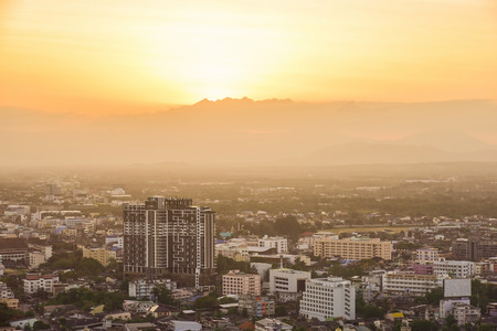 View of expanding city, changing environment. In the evening, the sun shines through cloudy sky and rain from the tower, The full-length landscape with buildings and architecture of Bangkok Thailand.