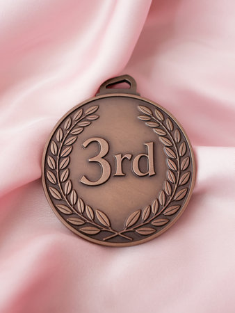 Bronze medal with '3rd' engraved, resting on soft pink fabric, symbolizing achievement.
