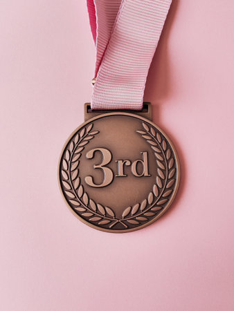 Bronze medal with '3RD' engraved, hanging on a pink ribbon against a soft pink background.