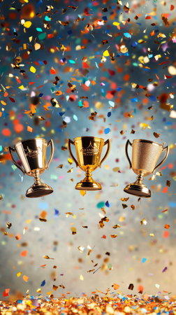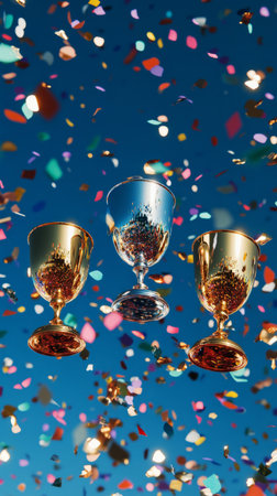 Shiny gold, silver, and bronze cups float through a vibrant sky with colorful confetti, radiating a dynamic, festive mood perfect for victory and celebration visuals