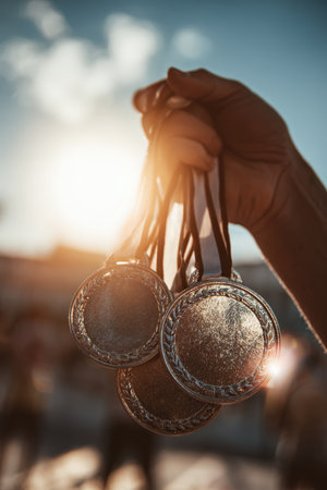 Athletes' hands proudly hold medals against a bright sky, capturing a cinematic victory moment. The image features sharp details and glowing reflections, evoking an emotional tone.