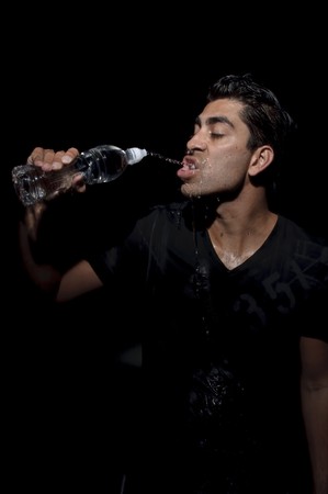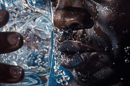 The image captures a man holding a sports drink, droplets glistening against a dark background. His intense expression suggests determination as he prepares to quench his thirst.