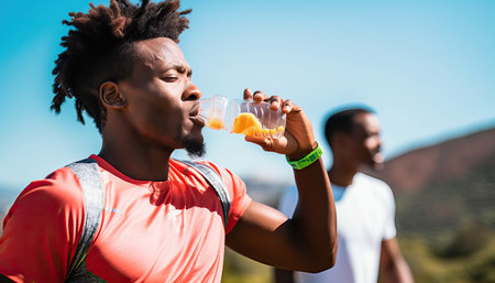Fitness african athlete drinking energy drink outdoor , Fit people resting taking a break after workout , Healthy lifestyle.