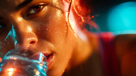 Close-up of a sweaty woman drinking water from a bottle after workout, symbolizing hydration, health, and fitness recovery.Close-up of a sweaty woman drinking water from a bottle after workout, symbolizing hydration, health, and fitness recovery