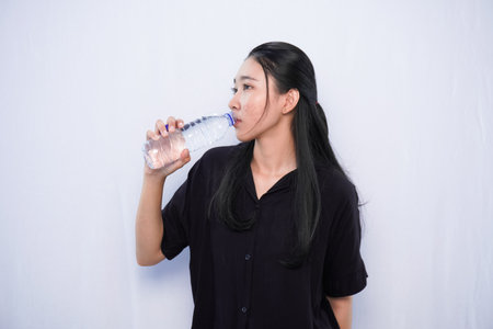 Asian girl with purple drinks water from a plastic bottle on a white isolated background. Generation Z. The concept of thirst