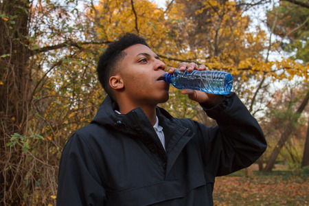 Young black man drinking water from a plastic bottle in the field on a colorful autumn day.