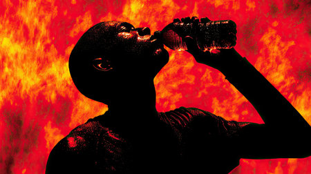 A striking silhouette of a person drinking water is captured against a fiery background, symbolizing thirst, survival, and resilience in extreme conditions.