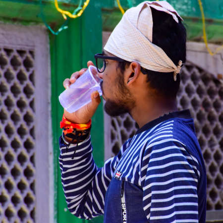 Outdoor portrait of Young man looking on Batur volcano and Agung mountain view at morning from Kintamani, Bali, Indonesia and drink water