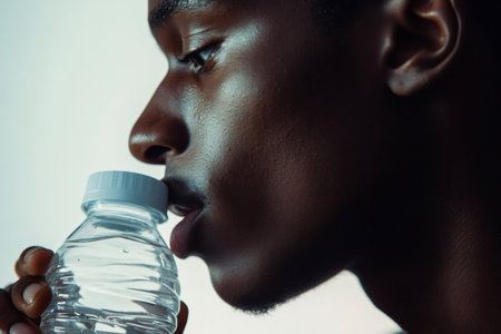 Close up profile of a young African American man drinking water from a small plastic bottle, promoting hydration and healthy lifestyle