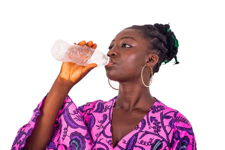 portrait of a beautiful thirsty young businesswoman wearing traditional loincloth and drinking mineral water from a plastic bottle.