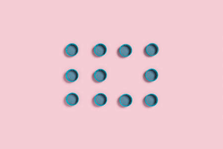 Plastic pollution concept. White plastic lids on dark background located diagonally. Single-use plastic. Refuse single-use plastic concept. Save ecology