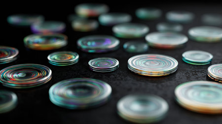 Holographic suction cup user interface elements float above a dark glass surface, displaying stunning colors and intricate designs.