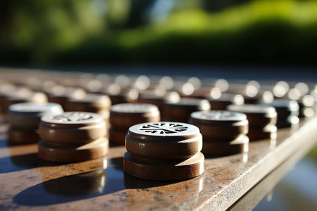 Wooden chess pieces on a metal surface in the park. Selective focus.