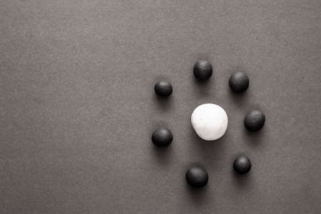 Small black plasticine balls surrounding a larger white one. Concepts of oppression and racism, diversity and violence in these modern troubled times. Area left for copyspace