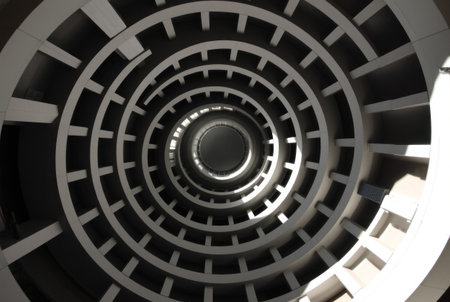 Black circular structures in blue-gray architecture with reflections in the water. Modern design and geometry concept.