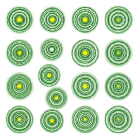 This image features an array of abstract circular shapes in various shades of green, blue, and yellow against a clean white background, creating a modern artistic vibe.
