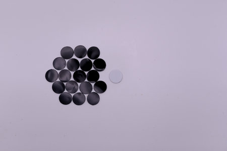 Twenty-four black discs clustered together with one white disc apart, illustrating contrast and individuality on purple surface.