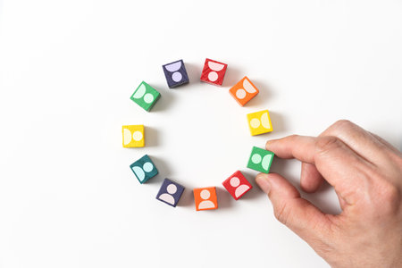 Concept of data or people centralization and gathering, using circle of colorful wooden blocks representing unity of diverse elements or people isolated on white background.