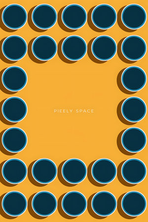 Orange plastic flat circles lie chaotically on a yellow background. Copy space
