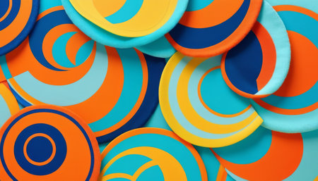 A visually captivating abstract design featuring geometric circular patterns in blue, orange, and teal hues. The overlapping shapes create a dynamic and modern artwork ideal for contemporary decor.. AI Generation