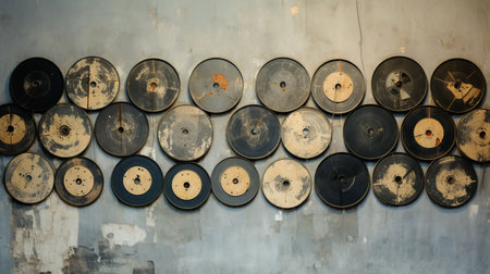 antique vinyl records, showcasing the industrial machinery aesthetics, are displayed on a wall. this unique arrangement combines elements of cambodian art, conceptual installations, and rounded forms. captured with the tokina opera 50mm f14 ff lens, the photograph highlights the patinated and oxidized textures of the records. spot metering enhances the visual impact of this intriguing composition. ai generated