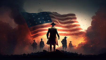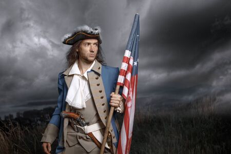 Man in United States War of Independence soldier costume with flag posing in forest. 4 july independence day of USA concept photo composition