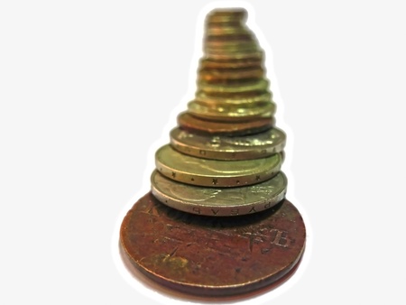 A stack of coins with the top one being a quarter. The coins are stacked on top of each other