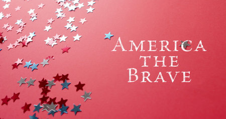Image of america the brave text and stars over red background. Veterans day, patriotism, american tradition and celebration concept digitally generated image.