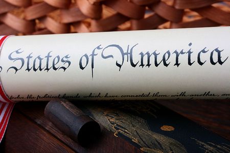 Closeup of a replica of U.S. Constitution document of grunge American flag on We the people Bill of Rights