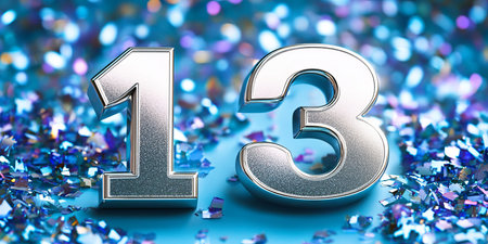 Vibrant Metallic Number Thirteen on a Shimmering Turquoise Bokeh Background for Celebrations