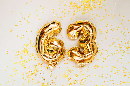 small foil gold balloons numbers 63 inflated with helium on a beige delicate background with gold sequins stars and balls. glittering holiday greeting layout