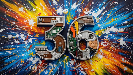 Vibrant metallic 1936 numbers against colorful abstract background.