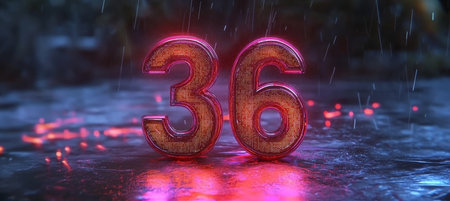 Futuristic Number Thirty Six, Glowing Digits on Wet Surface, Showcasing Modern Technology Design