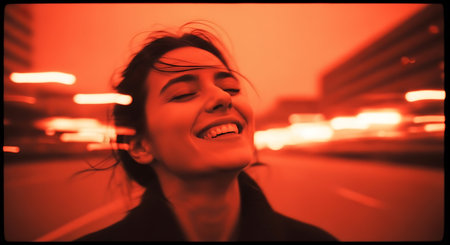 Cheerful Young Woman Beaming with Joy Among People
