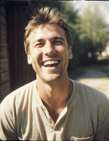Caucasian man 20-30 years old with brown hair and white teeth smiles. He is standing outside during the daytime. His face is illuminated by the warm glow of the sun making his smile even more radiant