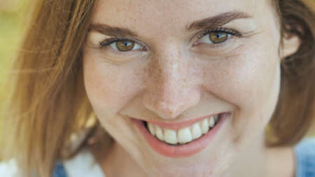 happy young beautiful woman face closeup and portrait outdoor at sunny day