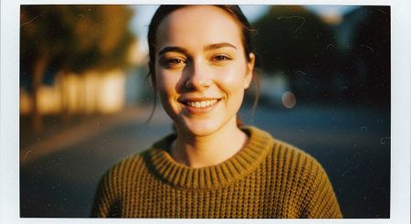 Portrait of a beautiful smiling young woman in a sweater on the street