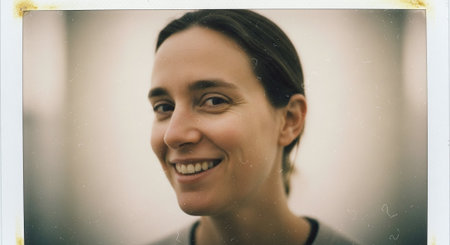 A young woman with blonde hair smiling warmly, wearing a striped shirt, soft lighting creating a cozy atmosphere