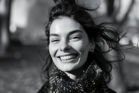young sexy woman or girl with long brunette curly hair on pretty smiling face in autumn seasonal forest or wood sunny outdoor on natural background, black and white