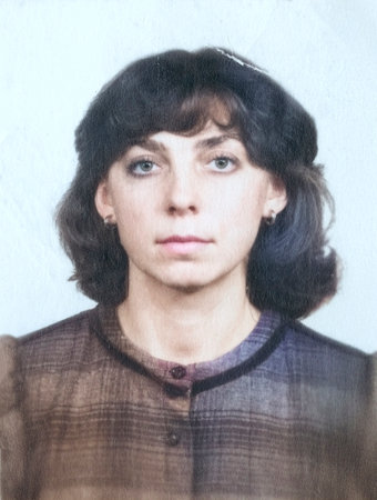 Vintage portrait of a young, serious-looking woman with curly brown hair. Retro photo, 1984.