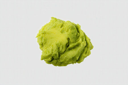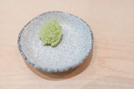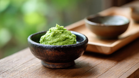 This vibrant green wasabi paste sits in a rustic bowl, showcasing the beauty of fresh ingredients against a natural wood backdrop, perfect for culinary inspiration.