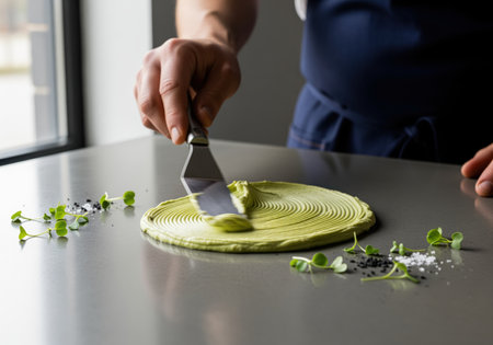 Chef hand in a blue apron spreading light green avocado cream or mousse in a circular pattern using an offset spatula on a glossy gray surface, garnished with microgreens and salt.