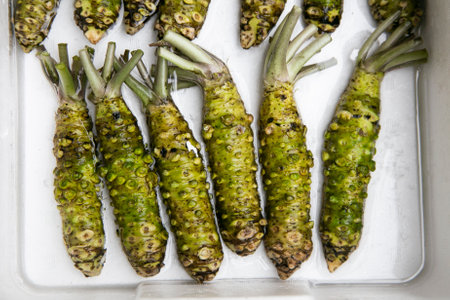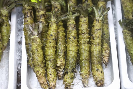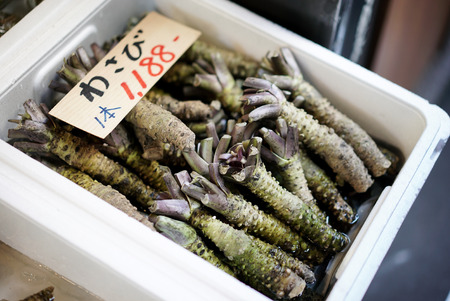 Fresh wasabi roots at a food stall at the Tsukiji Outer Market in the city of Tokyo in Japan.