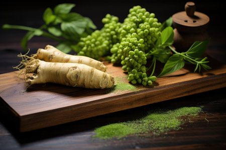 a close-up of fresh wasabi root on a wooden board, created with generative ai