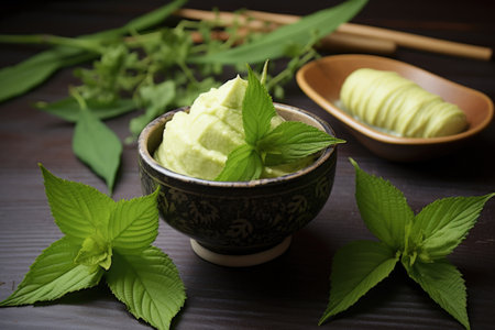 scoops of wasabi ice cream in a ceramic bowl with a wasabi root and leaves, created with generative ai