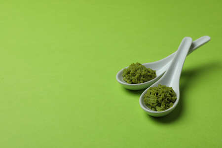 Green wasabi sauce or paste in bowl, with chopsticks or spoon over plain colourful background. selective focus