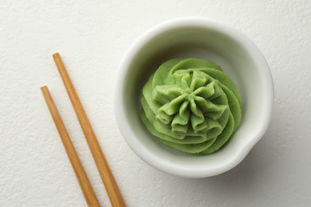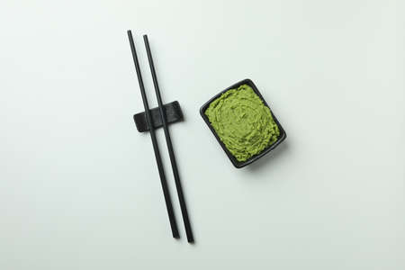 Hot wasabi paste in bowl and chopsticks on white table, top view